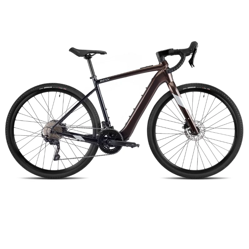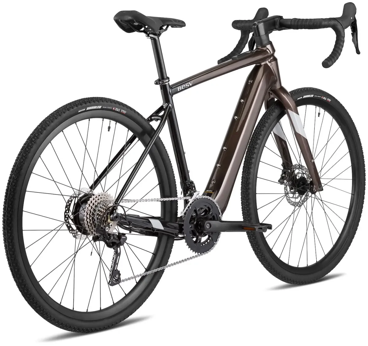 CADRECadre en alliage BESV avec batterie Darfon 360 W intégrée, pour moteur de moyeu arrière Bafang Couleurs)Ombre métallique avec noir nuit TAILLESS (45,5 cm) | M (49 cm) | L (51 cm) | XL (53 cm) FOURCHETTEFourche gravel tout carbone BESV, pivot carbone 1,1/8″-1,5″ |