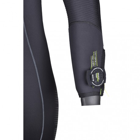 Manchon visage aminci (-2 mm) sur la monopièce col avec une zone autour du visage sans couture pour plus de confort, d’étanchéité et de durabilité. Col lisse intérieur pour plus d’étanchéité et fermeture finement ajustable grâce à un scratch élastique et un grip non agressif qui ne s’agrippe pas sur le jersey et les coutures. Double manchon poignet et cheville zippé avec manchon intérieur à retourner, en jersey intérieur et néoprène lisse extérieur. L’extrémité de la couture d’assemblage des manchons intérieurs est coupée à 45° pour plus d’élasticité et de solidité lors de l’habillage.
