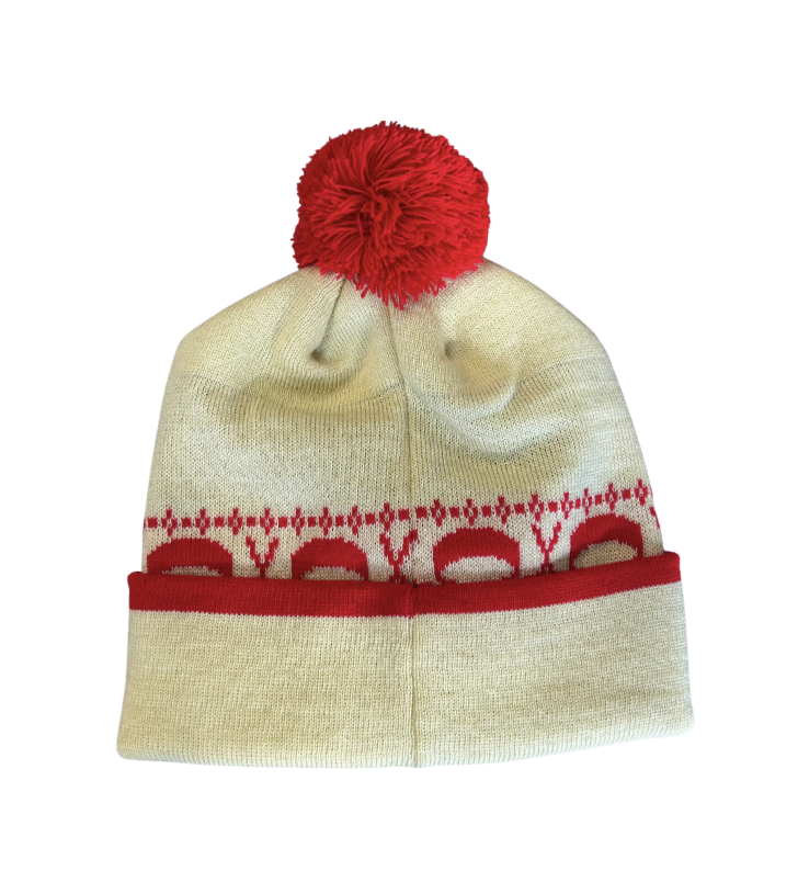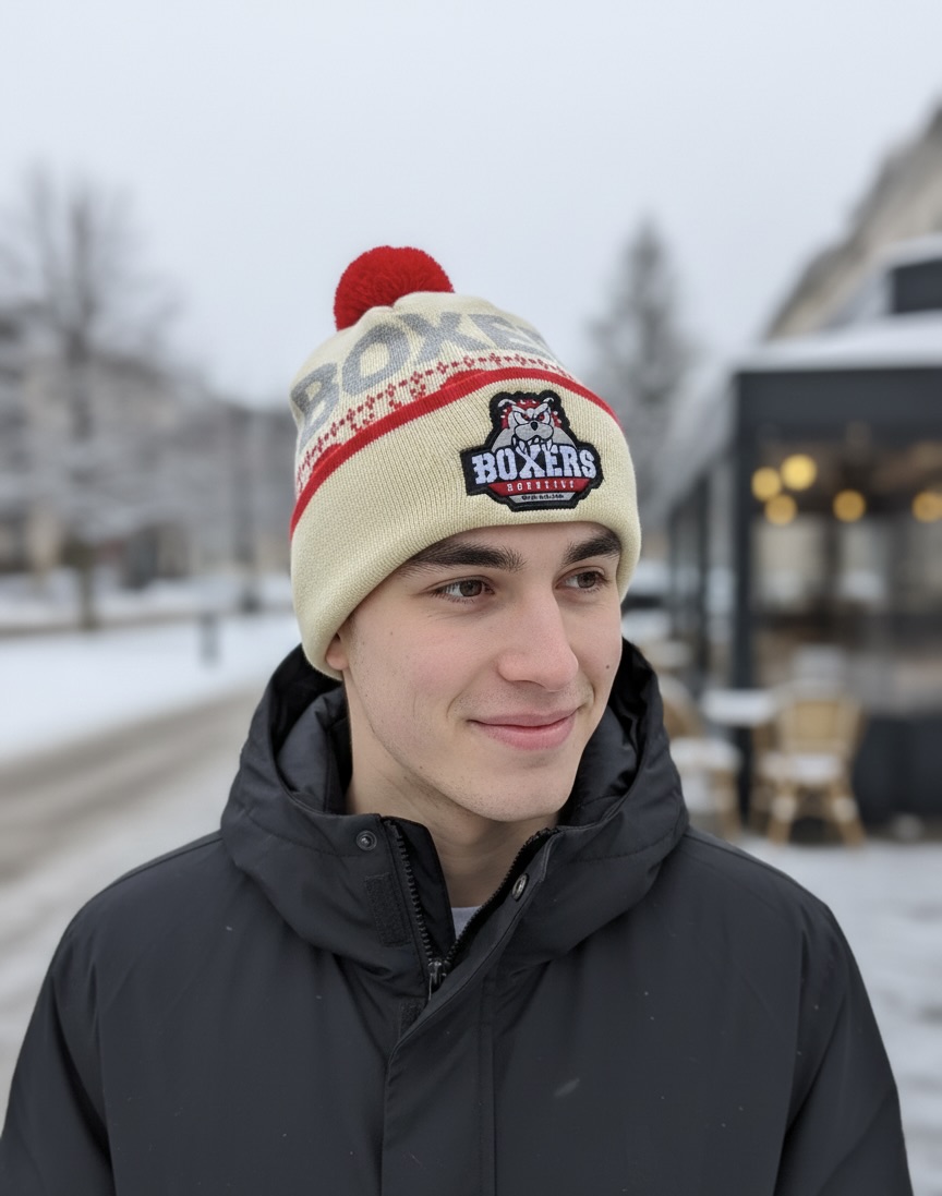 Bonnet Boxers beige avec pompon rouge, chaud et confortable. Attention, quantité limitée !