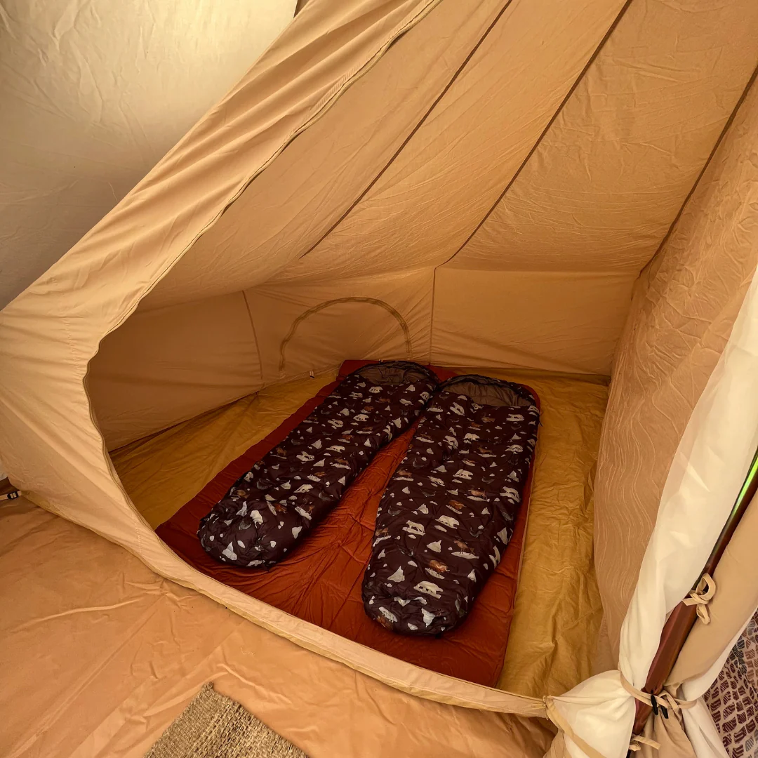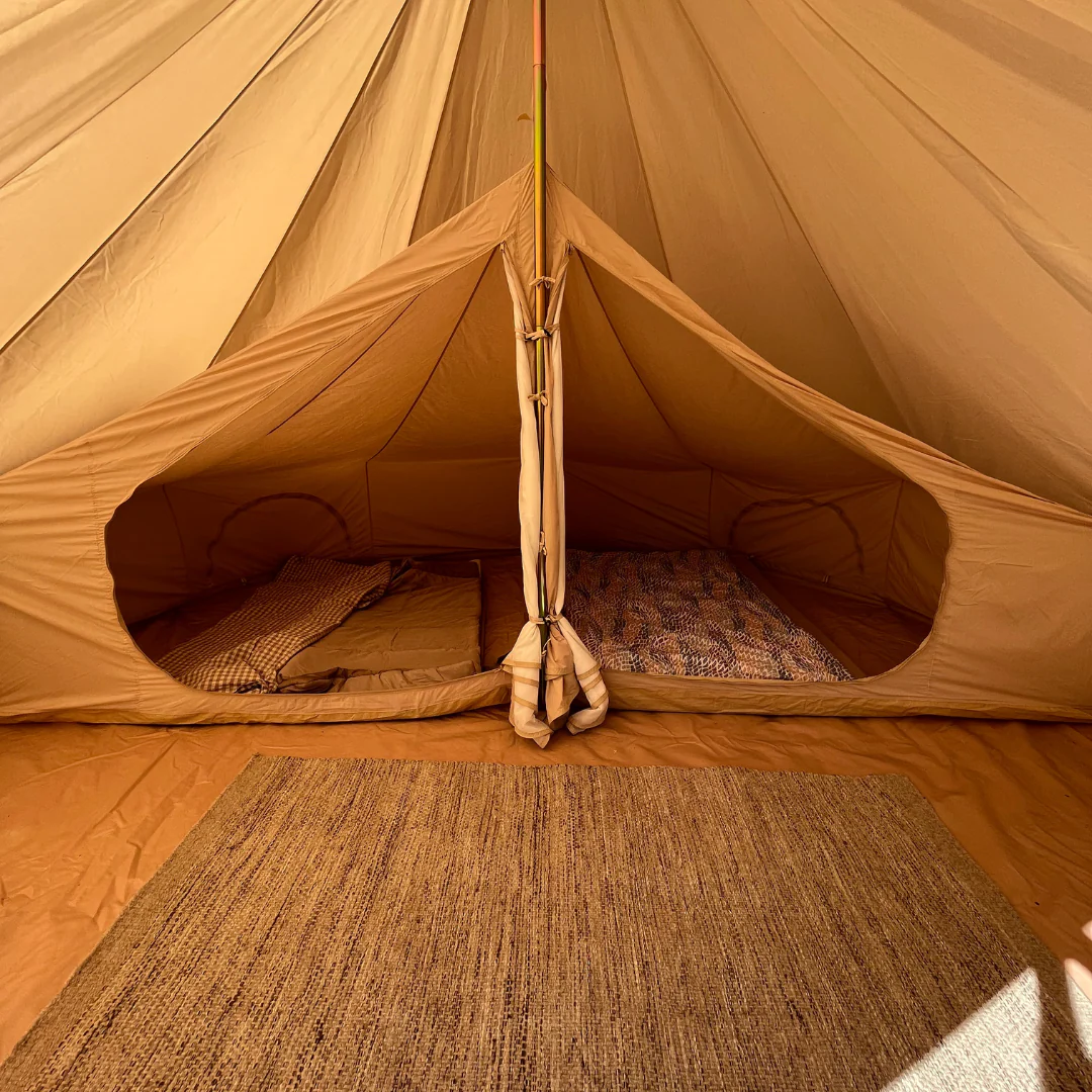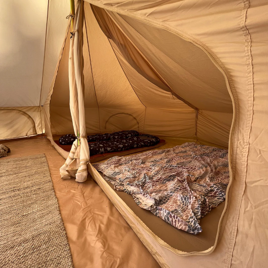 Les tentes intérieures peuvent être un excellent complément à votre tente de glamping. Avec une tente intérieure, vous obtenez une zone dans la tente dédiée à 100 % au sommeil. Vos matelas, sacs de couchage/couettes et vos affaires personnelles sont rangés, tandis que vous avez un espace commun ouvert devant les cabines de couchage.
