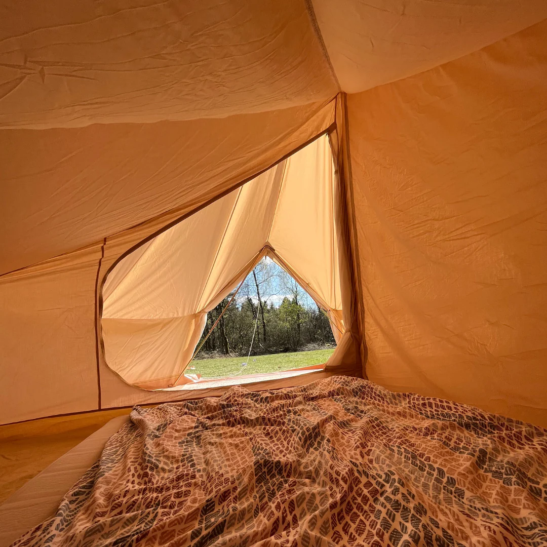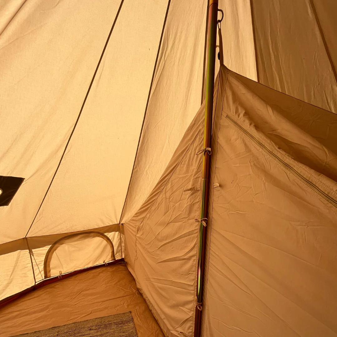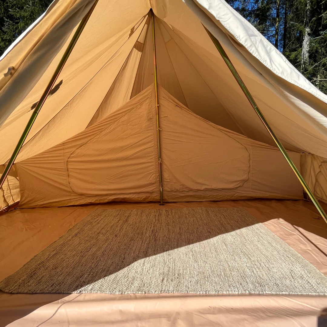 Les tentes intérieures peuvent être un excellent complément à votre tente de glamping. Avec une tente intérieure, vous obtenez une zone dans la tente dédiée à 100 % au sommeil. Vos matelas, sacs de couchage/couettes et vos affaires personnelles sont rangés, tandis que vous avez un espace commun ouvert devant les cabines de couchage.