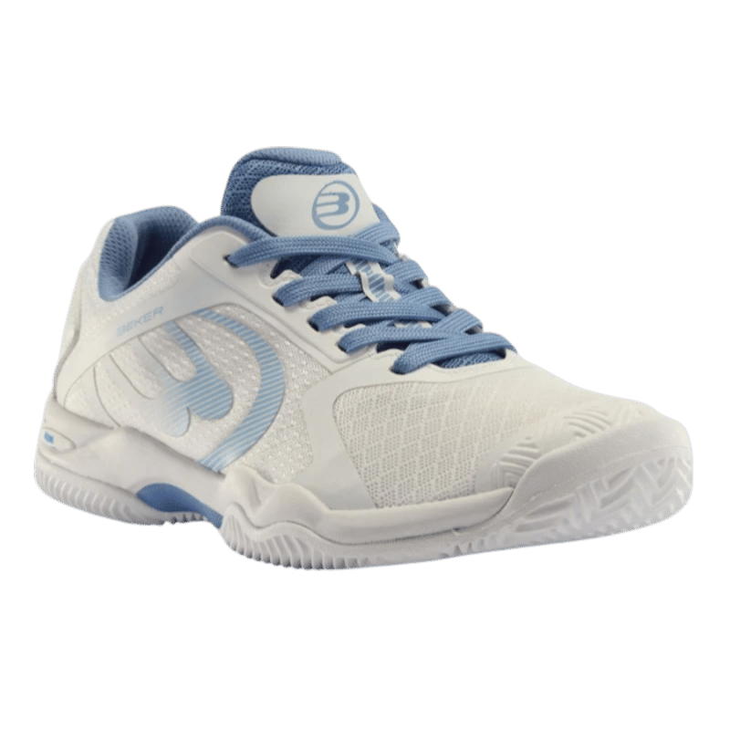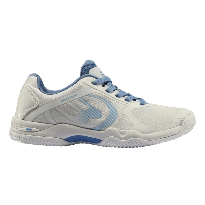 Bullpadel présente les chaussures de padel Beker 24V, un modèle spécialement conçu pour les femmes alliant confort, performance et style. Avec leur design blanc élégant agrémenté de détails bleus sur le logo, les lacets et la semelle, elles apportent une touche sportive et moderne sur le court.