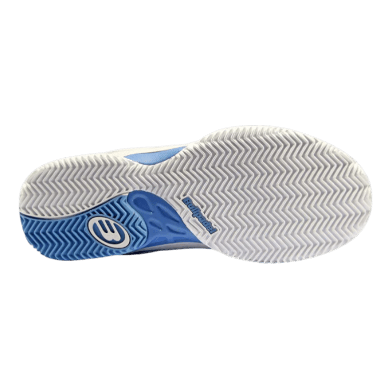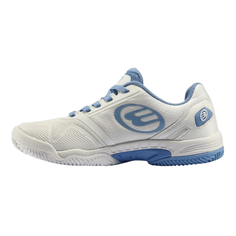 Les Bullpadel Beker 24V pour femme offrent respirabilité, confort et stabilité grâce à leur mesh ventilé, semelle EVA-phylon amortissante et crampons 3 mm, avec un design blanc élégant aux détails bleus.