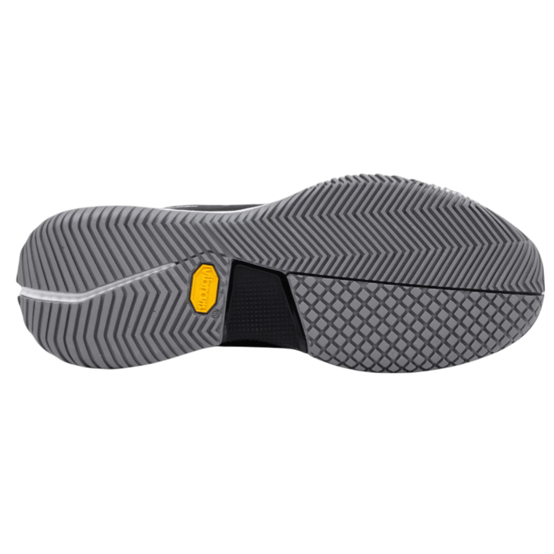 La semelle extérieure Vibram, avec son motif mixte, assure une adhérence et une durabilité exceptionnelles sur différentes surfaces, idéale pour les mouvements rapides et les changements de direction soudains caractéristiques du padel.