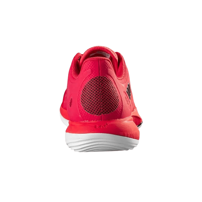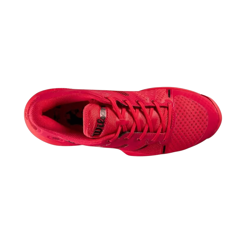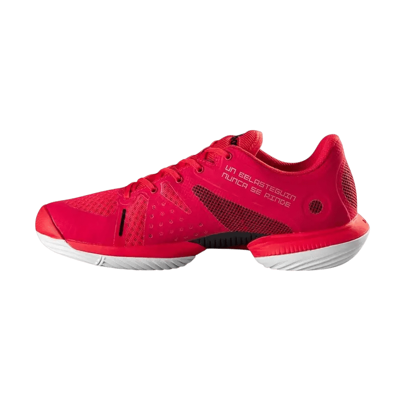 Wilson Bela Pro : chaussures de padel signées Fernando Belasteguín, design rouge avec logo Wilson noir et signature Bela grise. Flexibles et idéales pour des rotations rapides.