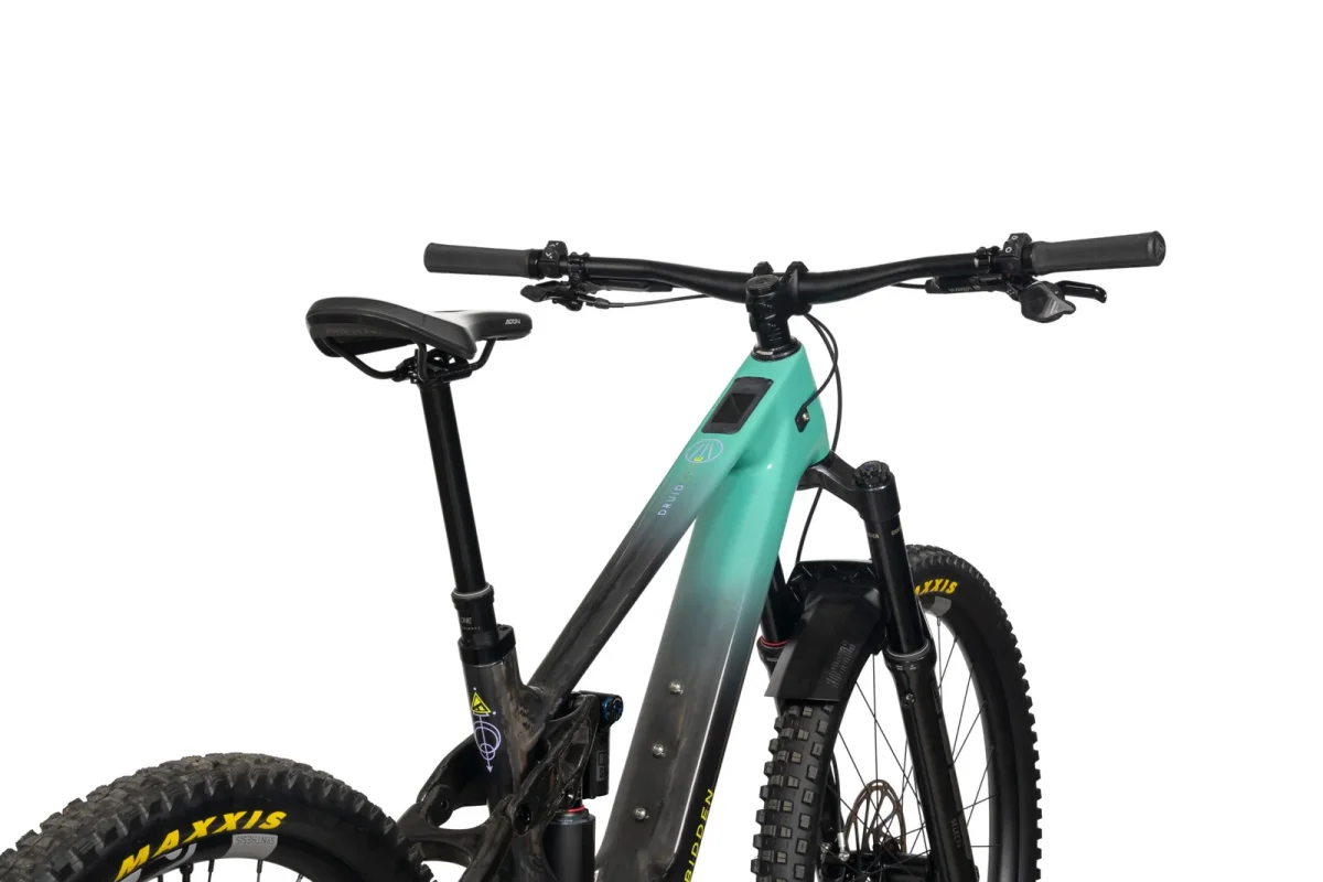 Cette version “Build 2” se distingue avec un équipement complet : transmission SRAM GX AXS T-Type 12 vitesses (cassette 10-52T), freins hydrauliques SRAM Maven Silver 4 pistons, roues Crankbrothers Synthesis e-Bike à large jante alliage, pneus agressifs (Maxxis High Roller / Minion DHR2). Le poste de pilotage est pensé pour l’enduro moderne : cintre OneUp très large (800 mm), potence courte, tige de selle télescopique OneUp à grand débattement selon taille