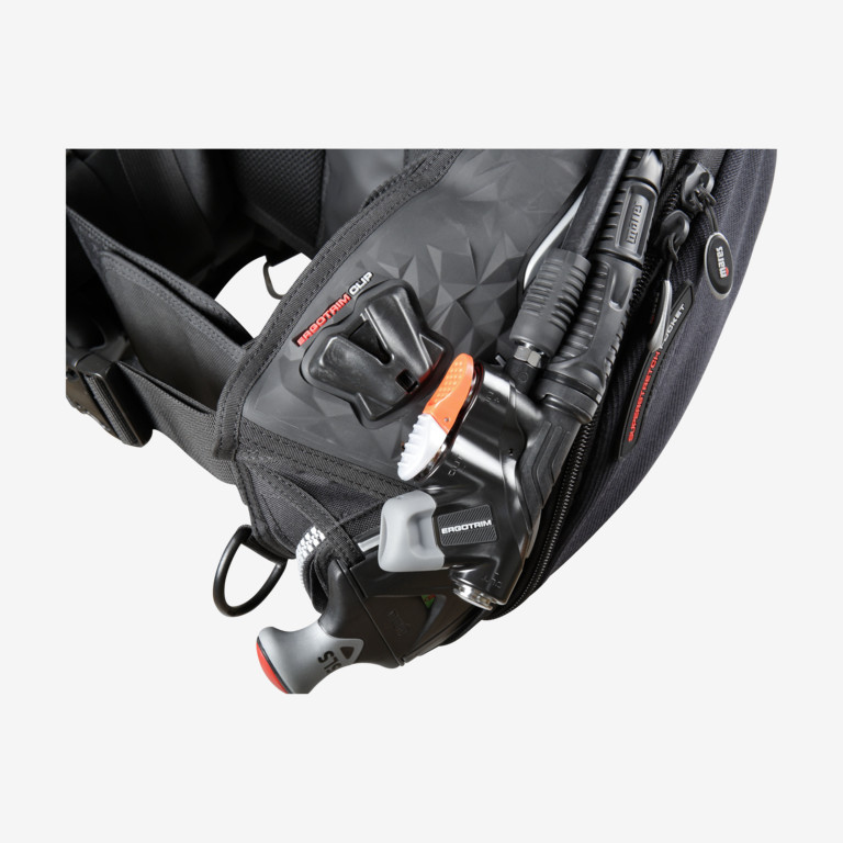 La technologie Ergotrim permet au plongeur d’ajuster son trim quelle que soit la position dans laquelle il se trouve. La commande Ergo peut être utilisée de manière standard par les instructeurs lors de la démonstration des compétences, mais fonctionne également comme un Airtrim lorsqu’elle est insérée dans son support dédié.