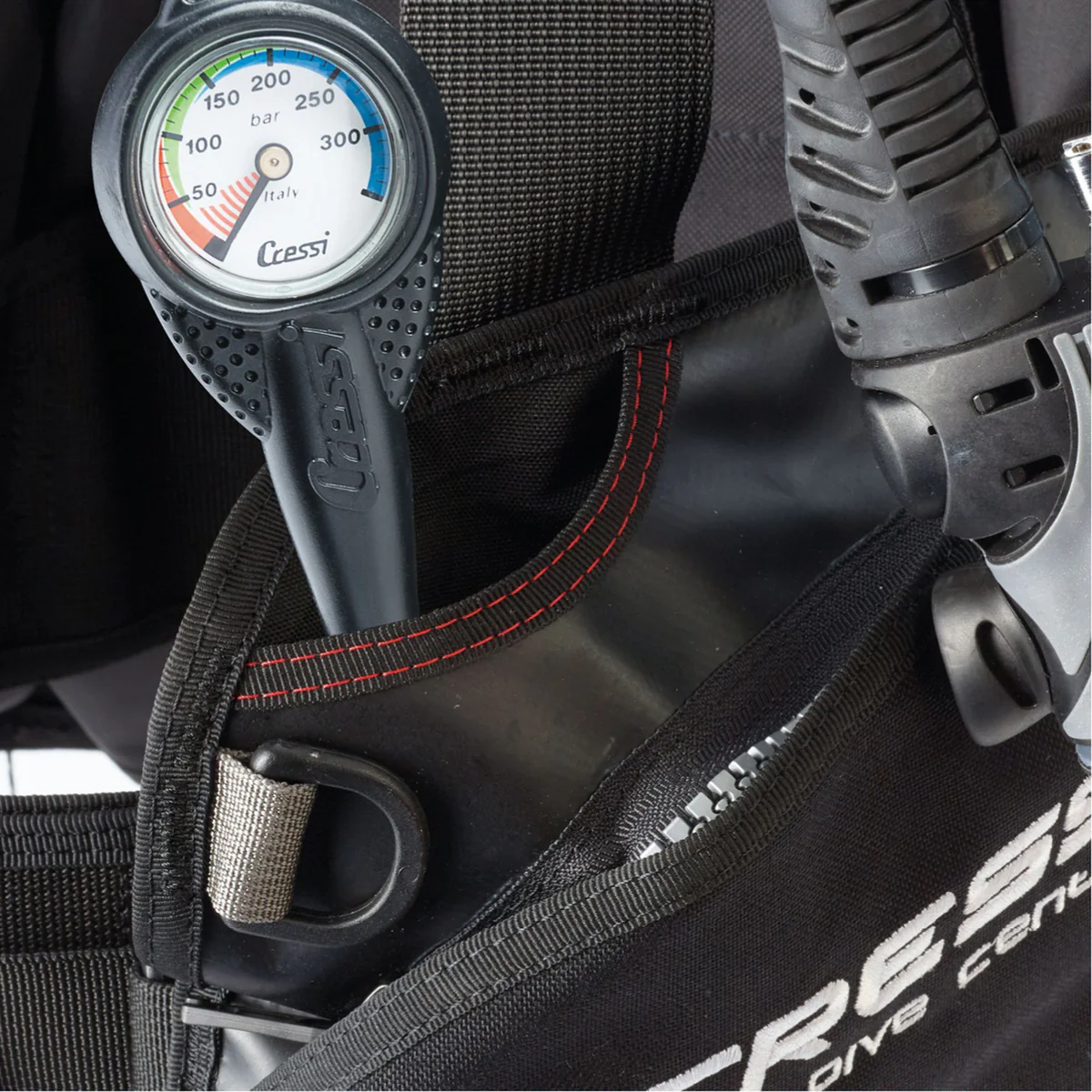 Bonne poussée de flottabilité, il est idéal pour les écoles, le diving ou la location. Il comporte une bande colorée de renfort dans la partie supérieure du sac, au niveau du cou, afi n d’augmenter la visibilité dans l’eau et le protéger de l’abrasion au premier degré. La sangle sternale est fermée par une boucle qui a également la fonction de siffl et d’urgence ou d’appel