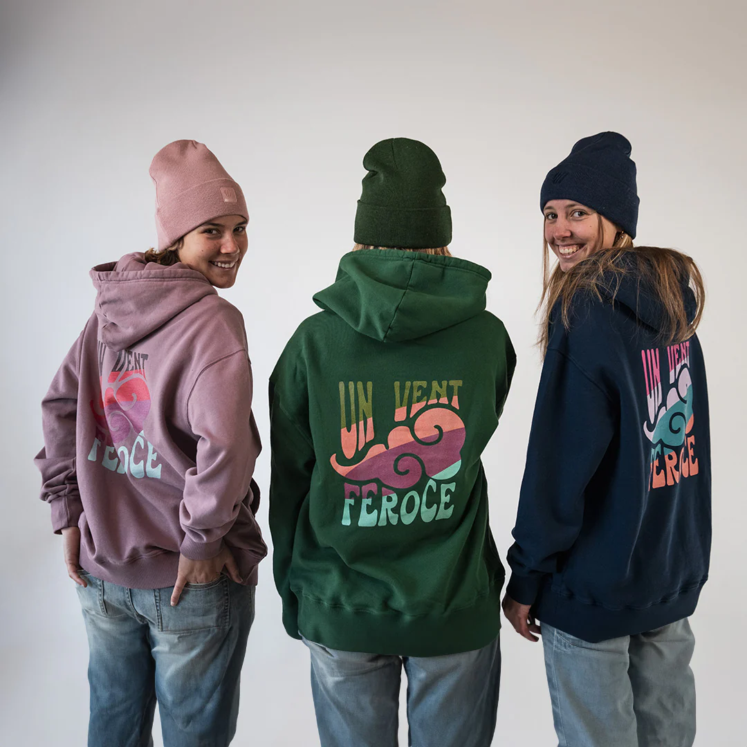 Le Hoodie » Le Vent » en coton 100% bio est disponible en vert sapin, bleu et rose. Tailles disponibles : du XS au double XL.