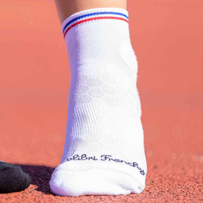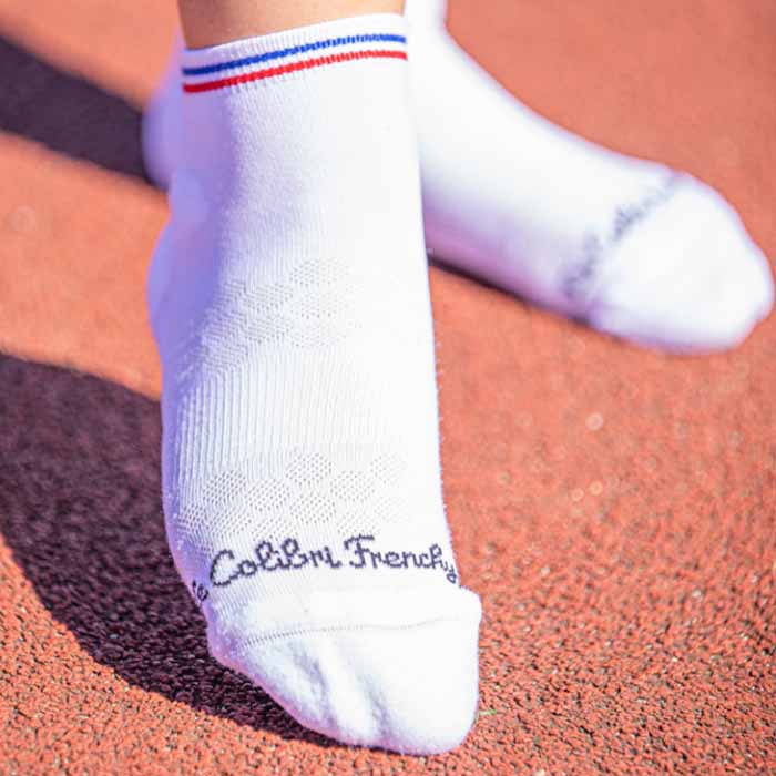 Ces socquettes de sport blanches de fabrication françaises sont à la fois légères, fines et respirantes. Elles possèdent des renforts au talon et sur la pointe du pied pour améliorer leur résistance et leur durée de vie pour avoir des chaussettes qui tiennent dans le temps. Ces socquettes de sport blanches remontent juste au dessus de la malléole afin de protéger la cheville.