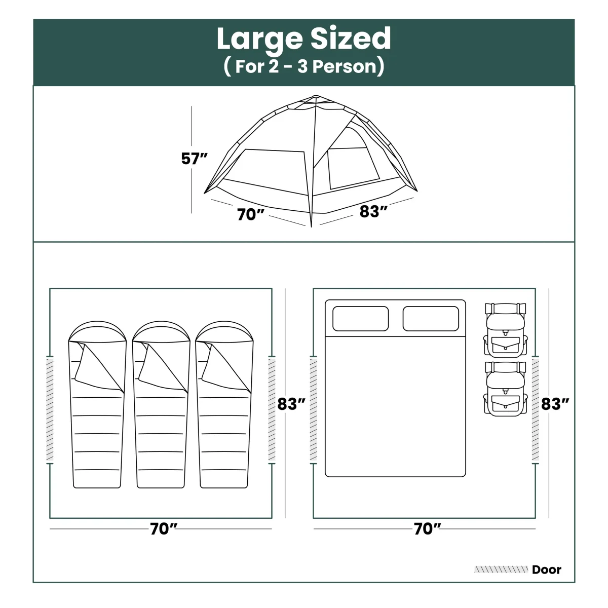 Large Tent (For 2-3 Person): 83″ x 70″ x 57″ (Packed Size: 30.3″ x 5.9″ x 5.9″); 9.2lbs