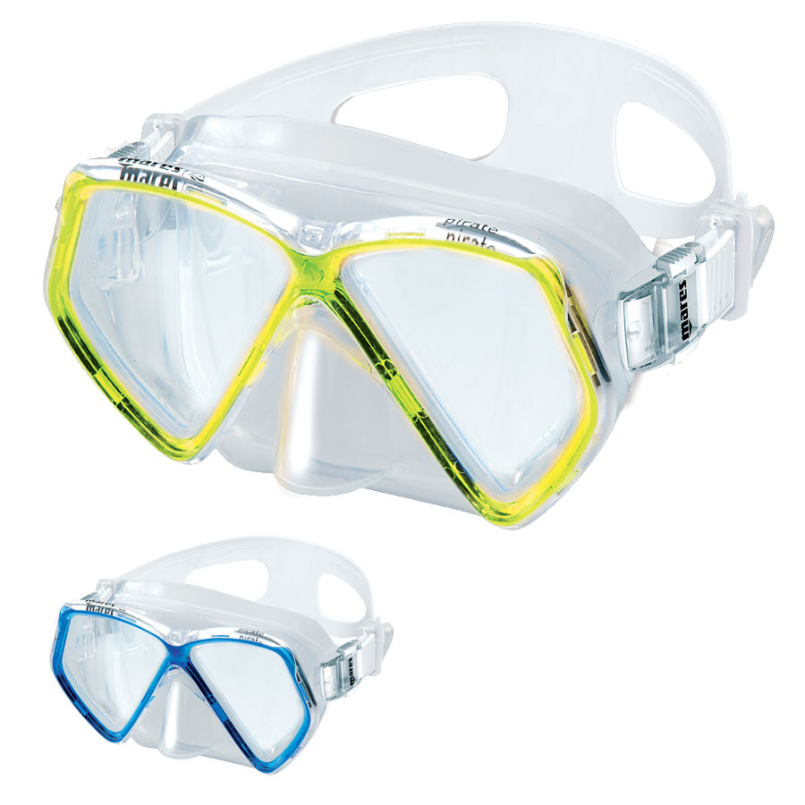 Masque snorkeling Pirate pour enfants avec deux lentilles et une large visibilité verticale, horizontale et périphérique. Boucles avec technologie EZ Adjust pour un réglage rapide et facile. Résistant et léger. Pièce faciale en silicone.