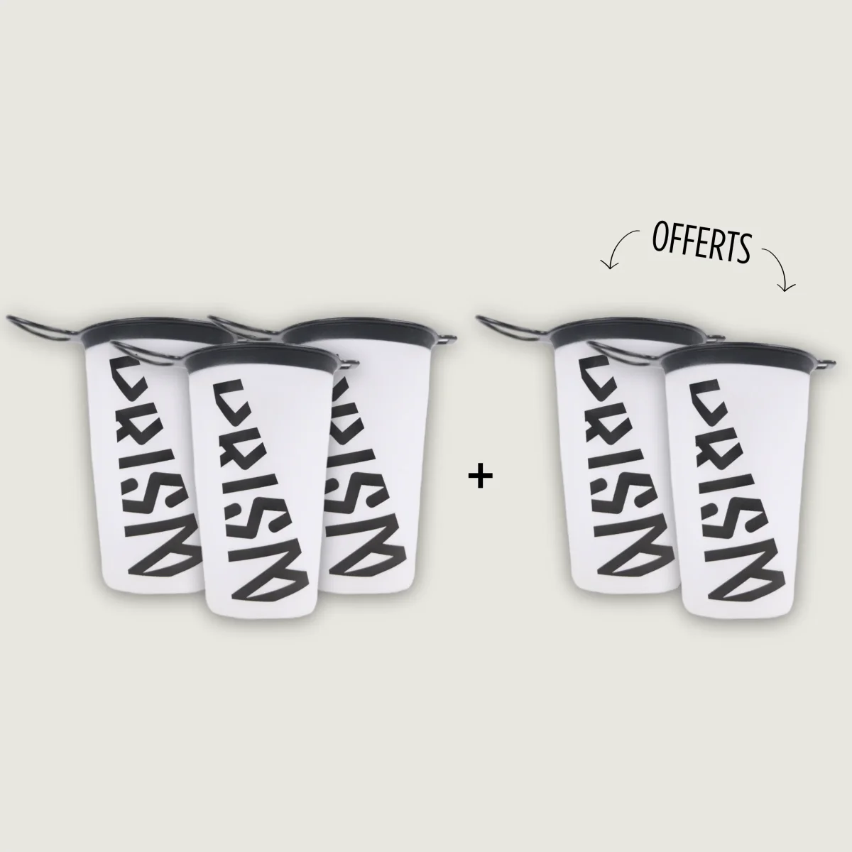 3 achetés = 1 offert ! Pack incluant 4 gobelets souples de 200mL, parfaits pour les pauses sportives et les ravitaillements grâce à leur format compact et léger.