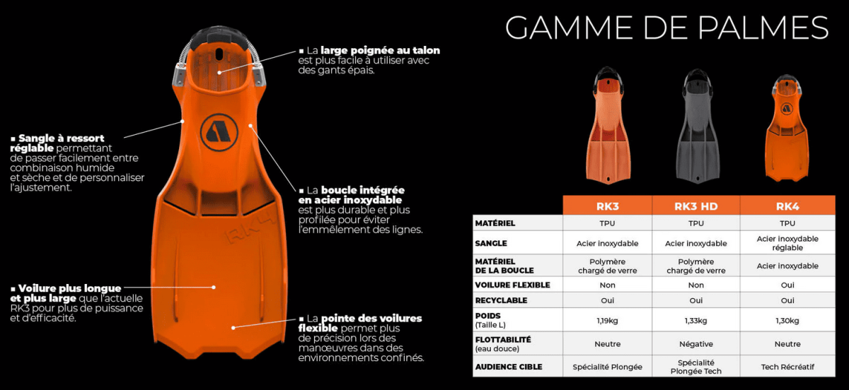 Économisez de l’énergie avec cette palme technique à voilure large et compacte. Elle offre une manœuvrabilité exceptionnelle dans les espaces restreints et les environnements difficiles. Adaptées pour une utilisation avec des combinaisons de plongée humides et sèches, les palmes RK4 sont parfaites pour le frog-kick et le back-finning.
