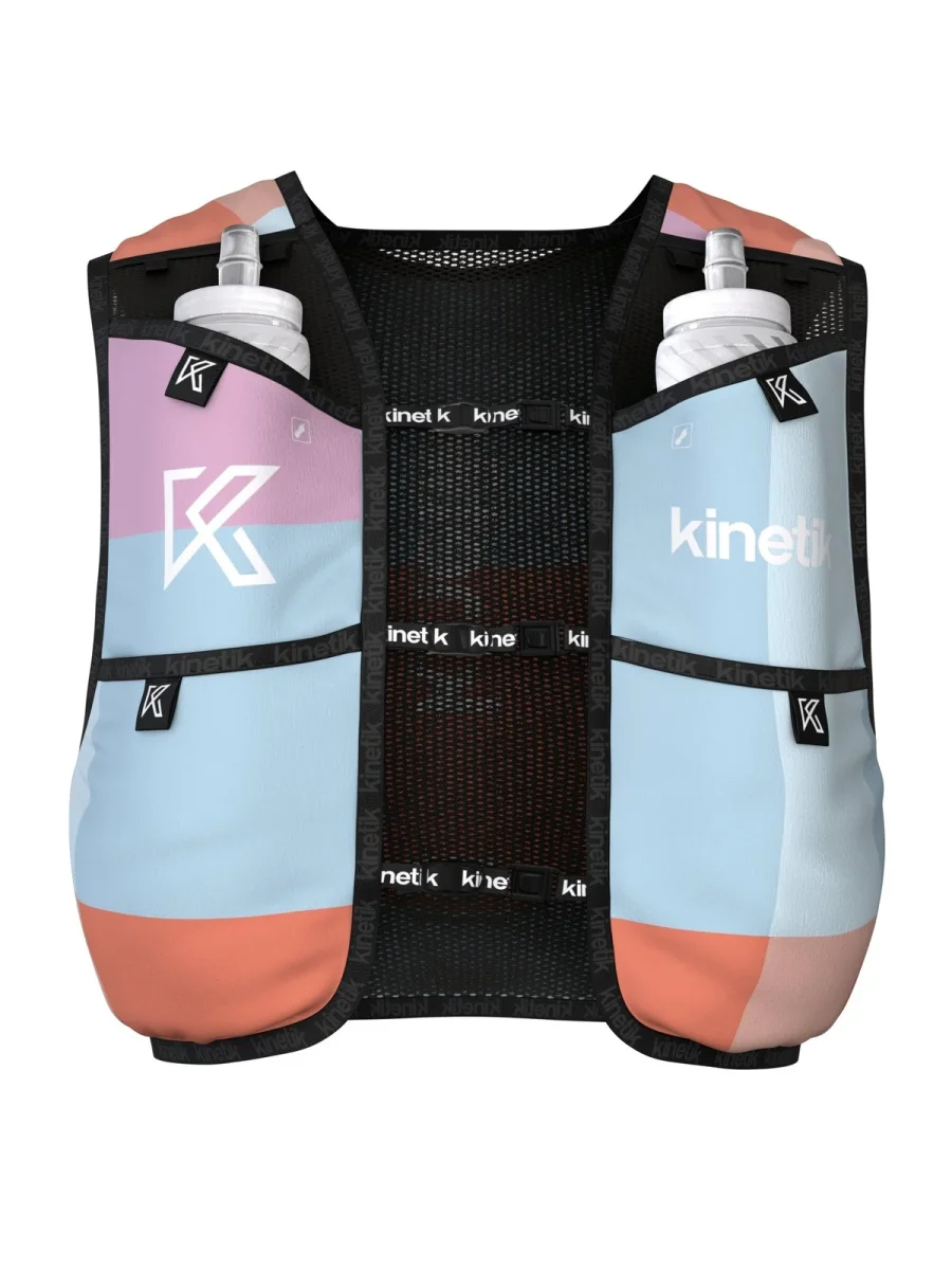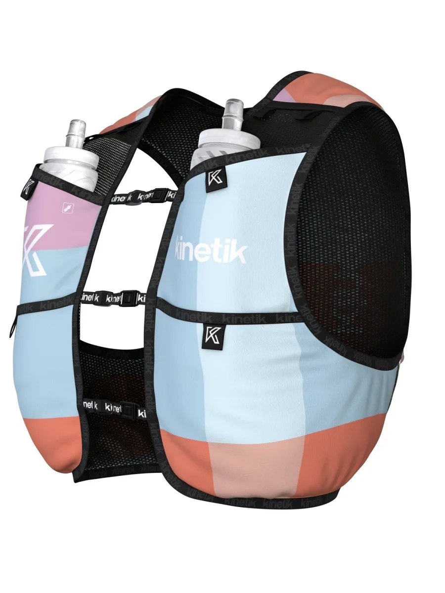 Le sac d’hydratation est toujours équipé de 6 poches dont 1 étanche pour le téléphone ,d’une grande poche arrière , deux poches hydro pouvant accueillir 2 flasques jusqu’à 500 ml, de deux poches devant pour « usage rapide » pour gels, barres énergétiques ou autres et enfin de deux nouvelles poches latérales indépendantes.