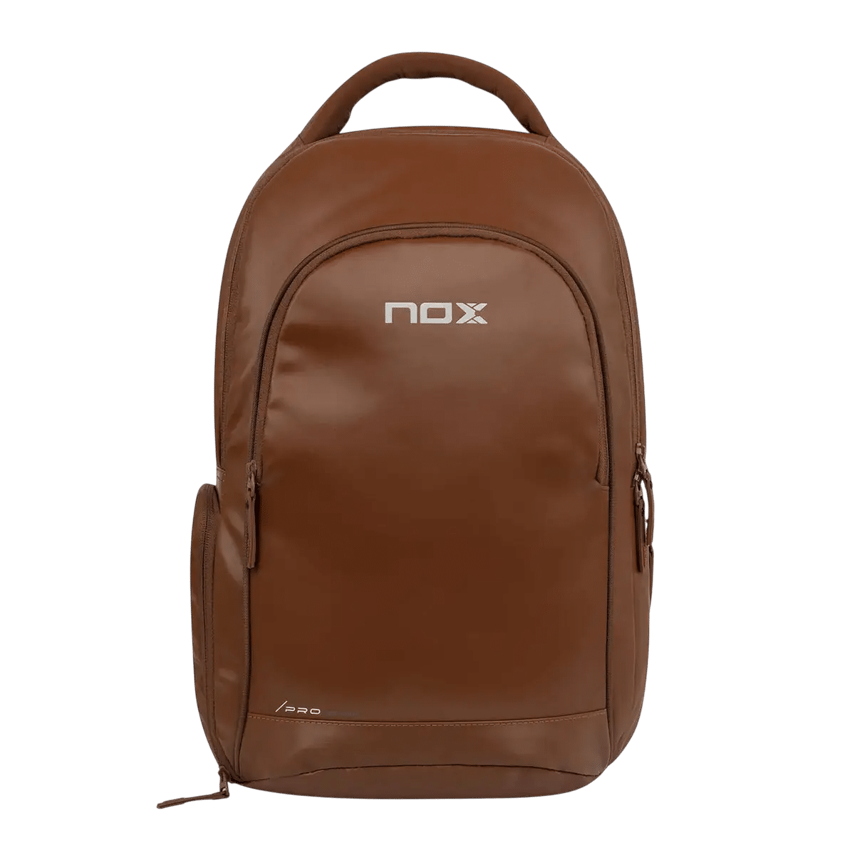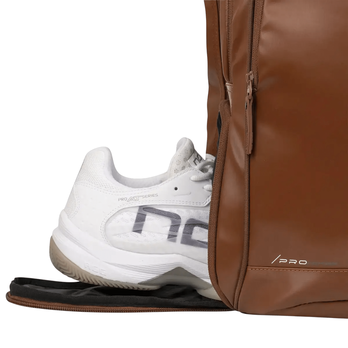 Sac à dos de padel Nox Pro Series avec compartiment protégé pour raquette, poche ventilée pour chaussures et multiples rangements. Ergonomique et spacieux. Coloris disponibles : blanc, noir, bleu marine et camel.