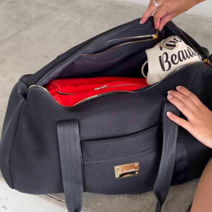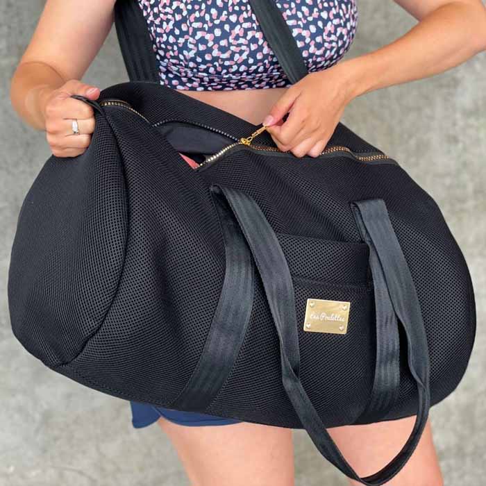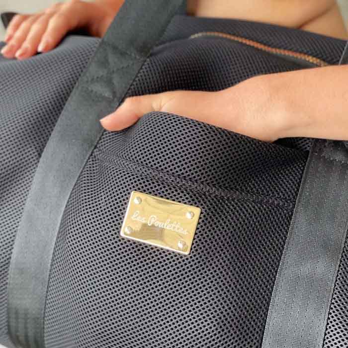 Pour mettre une touche colorée et choc, une plaque en or « Les Poulettes » figure sur le devant du sac de sport. Ce jolie sac noir pourra être utilisé pour le sport, mais également pour toutes vos autres activités de la journée !