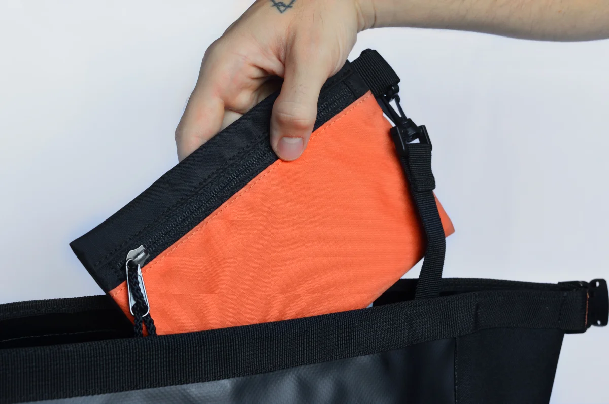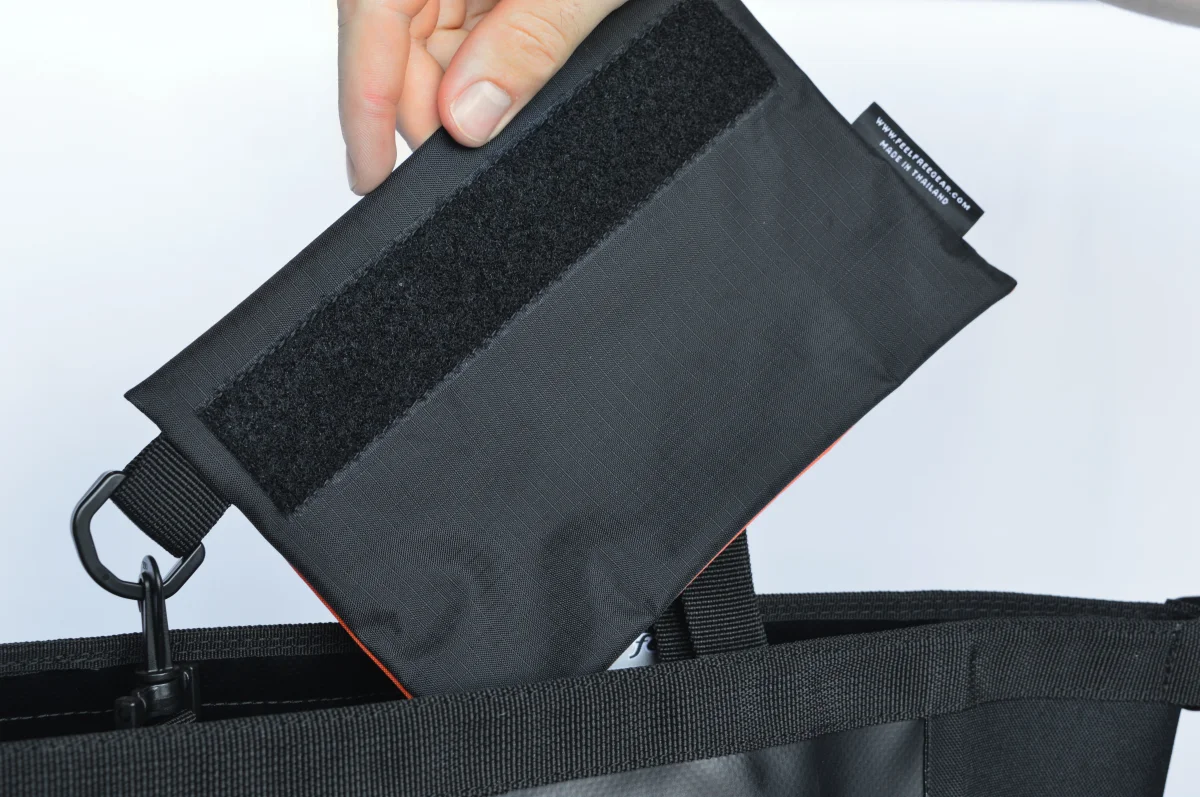 La combinaison du tarpaulin et de notre matériau issu de bouteilles plastiques recyclées nous donne une sacoche Eco responsable, extrêmement résistante, et bien sûr parfaitement étanche !