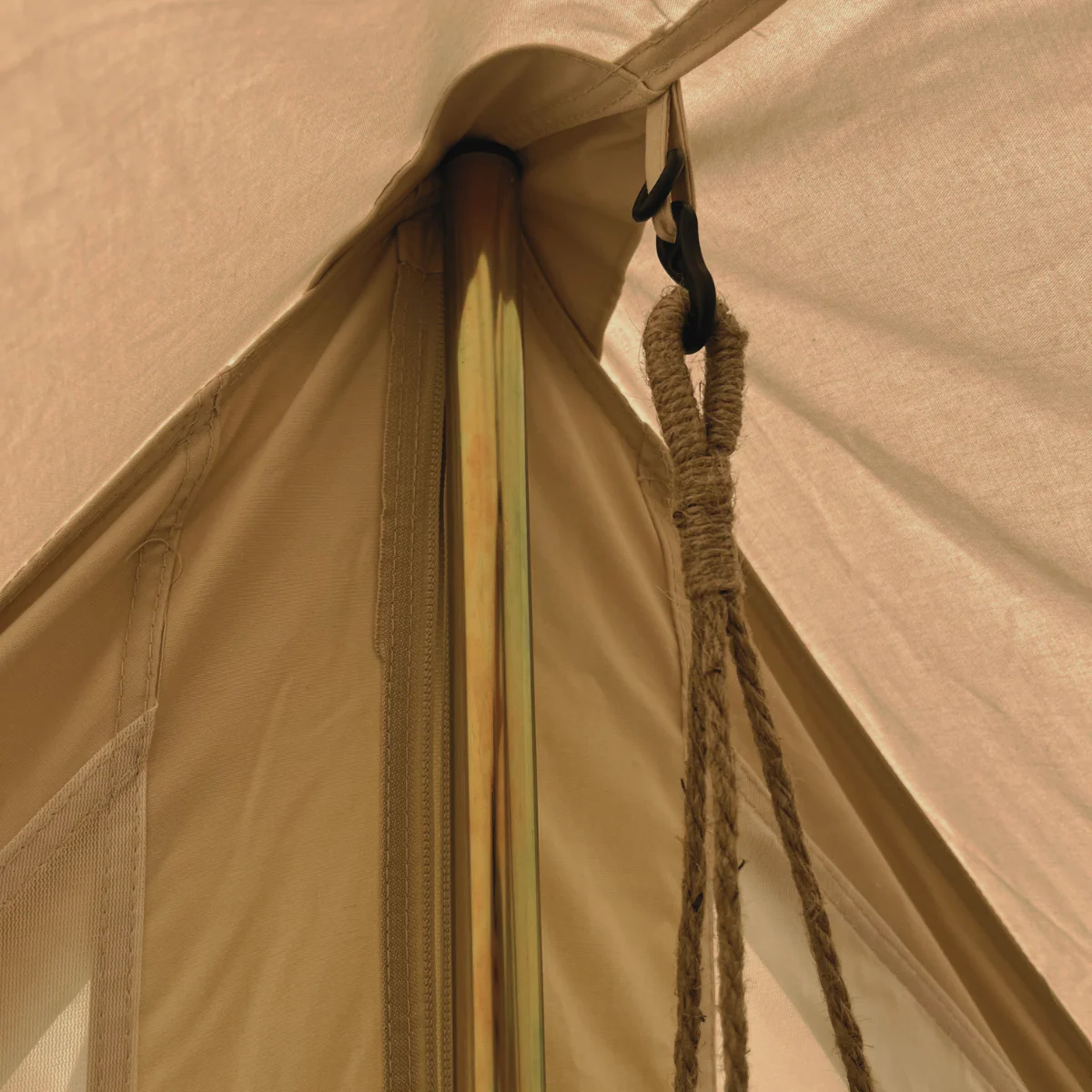 La hauteur des parois de 60 centimètres et le positionnement des poteaux tout au long des côtés de la tente permettent d’utiliser toute la surface au sol pour dormir. Cela permet à 5 personnes de dormir confortablement dans la tente sur un matelas de 60 cm de large, ou de créer de la place pour deux grands matelas pneumatiques doubles.