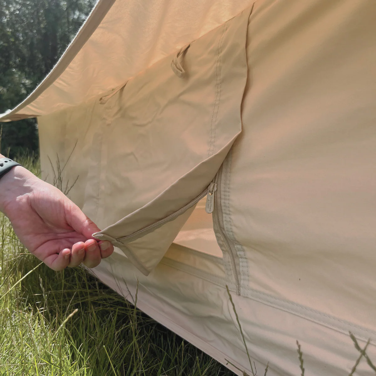 La tente dispose de portes aux deux extrémités qui assurent une bonne ventilation par temps chaud. De plus, il y a quatre fenêtres (deux de chaque côté), deux poches de rangement pratiques ainsi que deux crochets et anneaux au plafond pour suspendre une lanterne ou similaire.