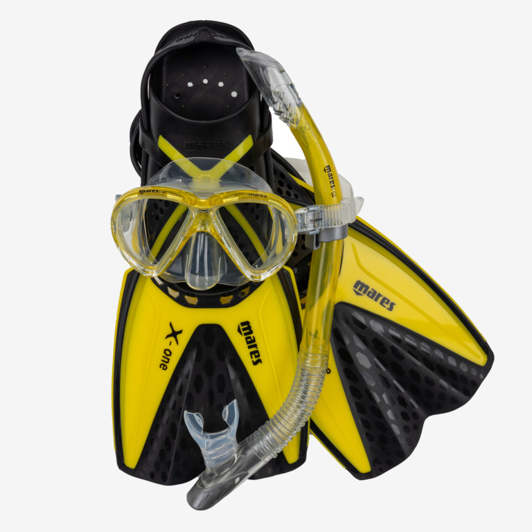 Le set Marea X-One pour adultes combine le masque de snorkeling Mare, la palme X-one et le tuba ergonomique.